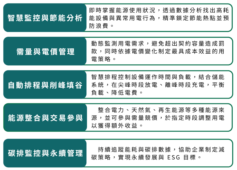 智慧EMS不只是監控工具,它是企業的「能源管家」,透過多項功能幫助你精準掌握每一度電: